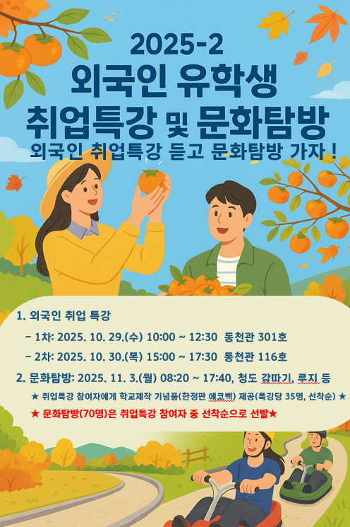 2025학년도 2학기 일반대학원 외국인 취업특강 및 문화탐방을 다음과 같이 안내하오니 많은 참여바랍니다.