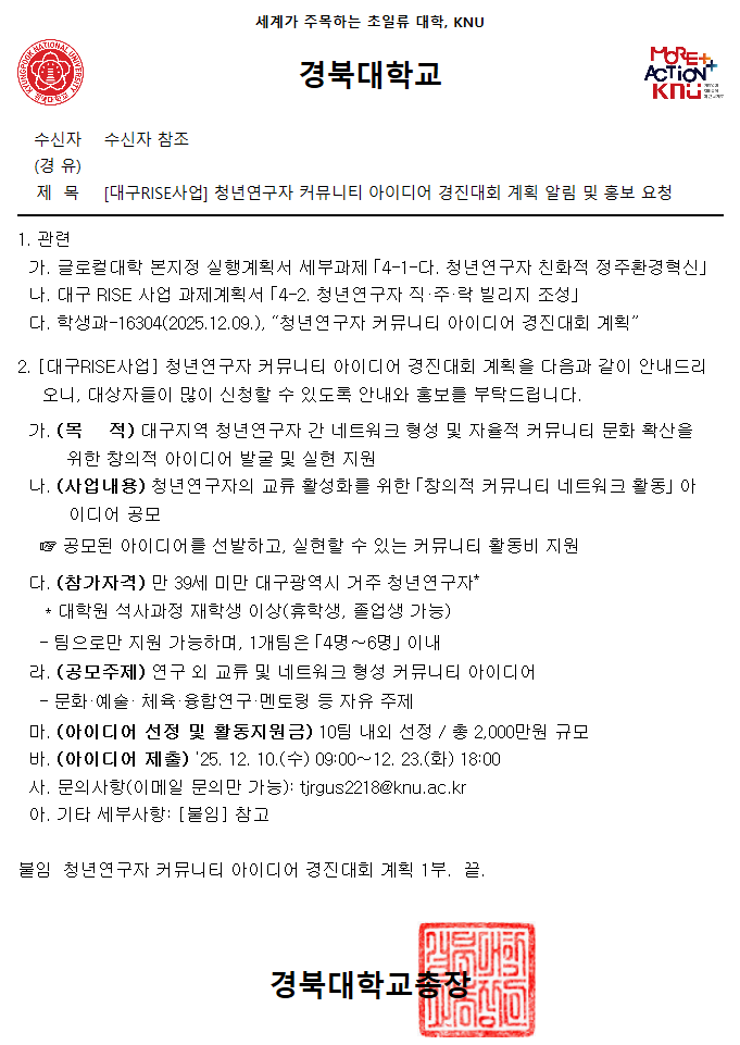 [대구RISE사업] 청년연구자 커뮤니티 아이디어 경진대회 계획 알림