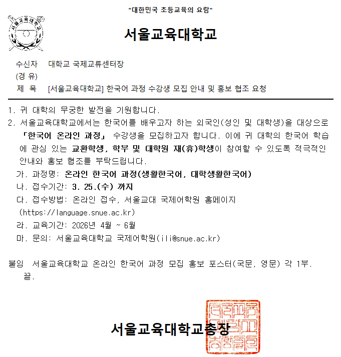 [서울교육대학교] 한국어 과정 수강생 모집 안내
