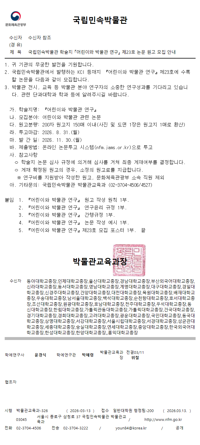 국립민속박물관 학술지 『어린이와 박물관 연구』 제23호 논문 원고 모집 안내