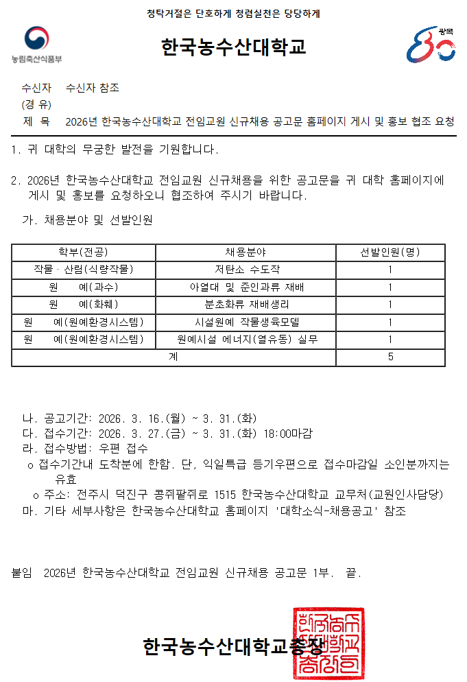 [본문] 2026년 한국농수산대학교 전임교원 신규채용 공고문 홈페이지 게시 및 홍보 협조 요청.pdf