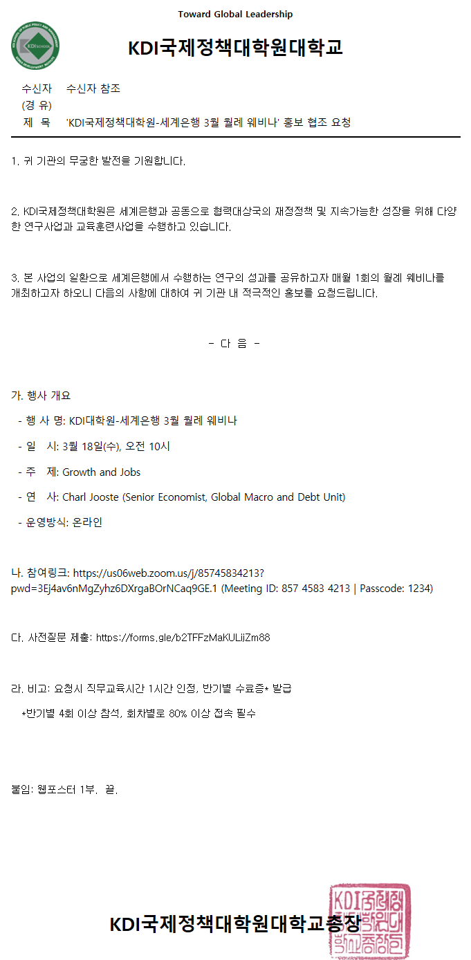 'KDI국제정책대학원-세계은행 3월 월례 웨비나' 홍보