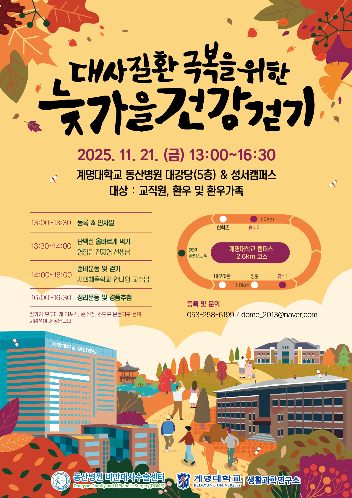 생활과학연구소와 동산병원 비만대사수술센터와 공동으로 대사질환 극복을 위한 늦가을 건강걷기를 아래와 같이 개최합니다.